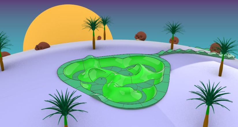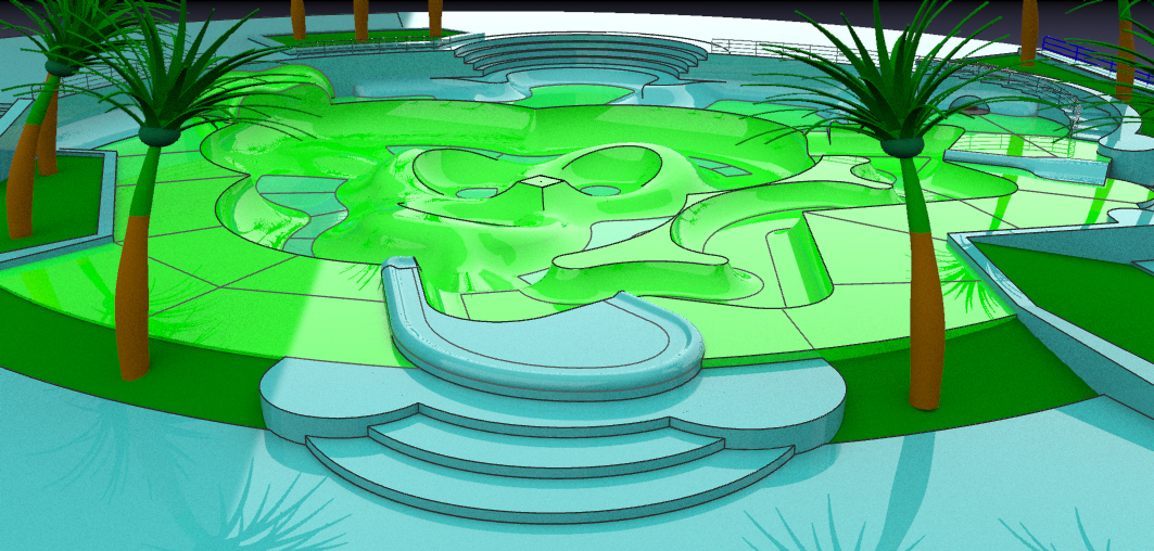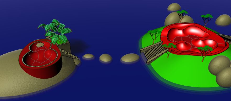 Another manifestation of trilateral symmetry. This park will be built on an artificial planet orbiting quite close to an ancient red dwarf star.The planet is tidally locked, one side always faces the star. The skatepark site is in the zone of perpetual dawn. Giant skulls guard the zone of lethal daylight.